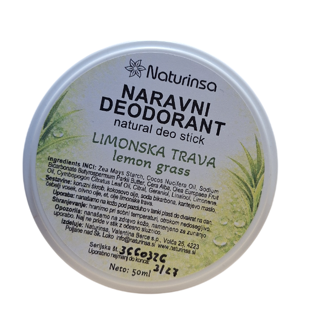 Naravni deodorant limonska trava v lončku vam zagotavlja dolgotrajno svežino in zanesljivo zaščito pred neprijetnimi vonjavami čez cel dan, s prijetnimi in poživljajočim vonjem po limonski travi. Hkrati omogoča naravno potenje, saj ne maši por, ampak skrbi za vašo kožo, da diha. Njegova lahka tekstura se hitro vpije, ne pušča madežev na oblačilih, kar omogoča brezskrbno uporabo.
