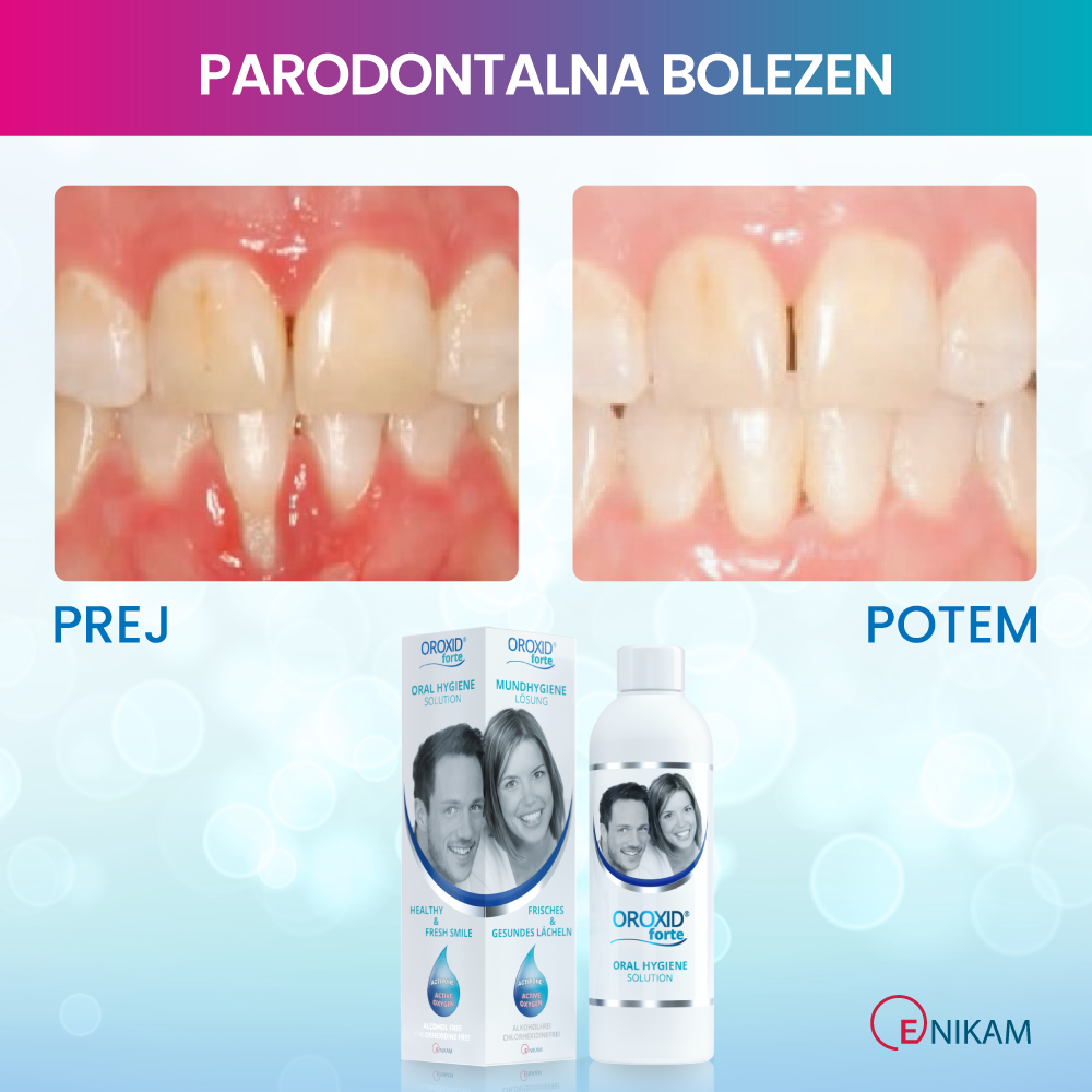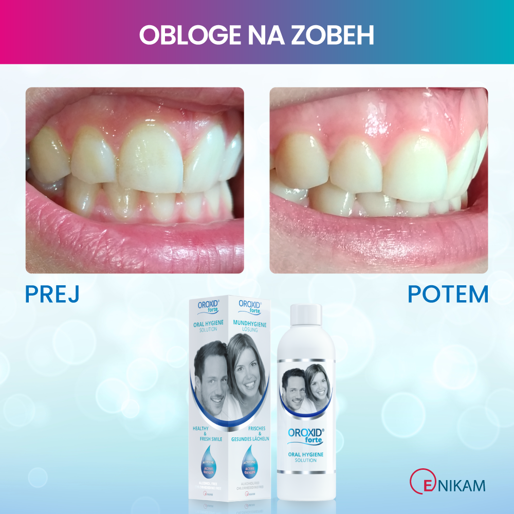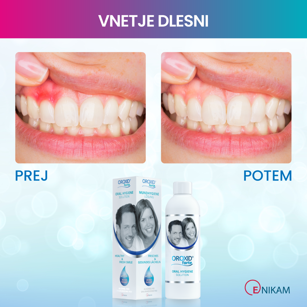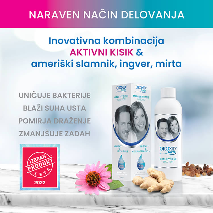 Oroxid forte oralna raztopina za intenzivno nego ustne votline je medicinski pripomoček na osnovi aktivnega kisika, ki ohranja zdrave dlesni, blaži vnetja in pospešuje celjenje razdražene ustne sluznice. Učinkovito zmanjšuje obloge, preprečuje slab zadah ter podpira regeneracijo po zobozdravstvenih posegih. Ne vsebuje alkohola in klorheksidina, zato ne izsuši sluznice in ne obarva zob.